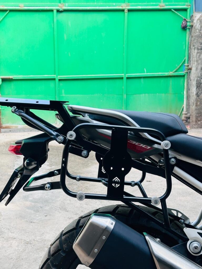 This integrated system combines a reinforced side pannier stay with a rear top rack platform, allowing riders to mount soft panniers, tail bags, duffel bags, and top boxes securely. Engineered for strength and load balance, the structure prevents luggage movement and wheel contact while maintaining proper motorcycle handling.